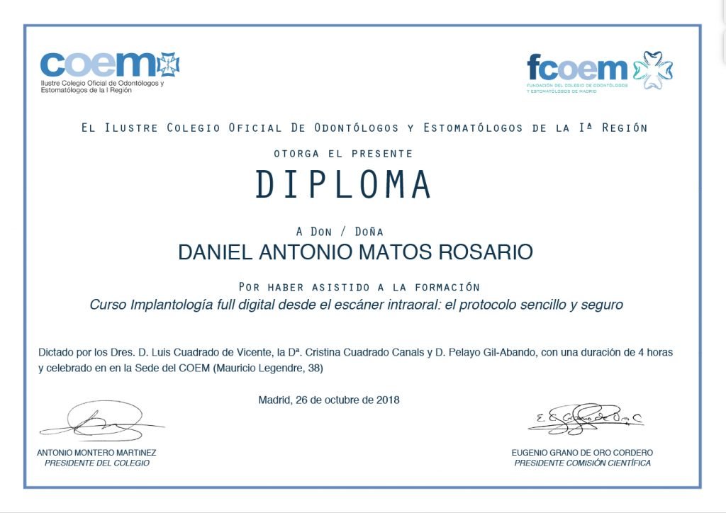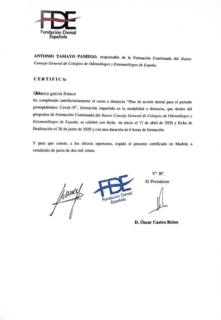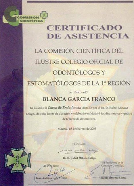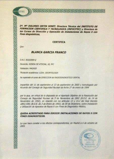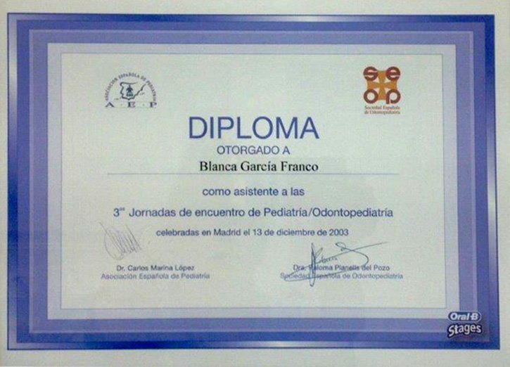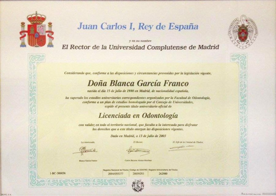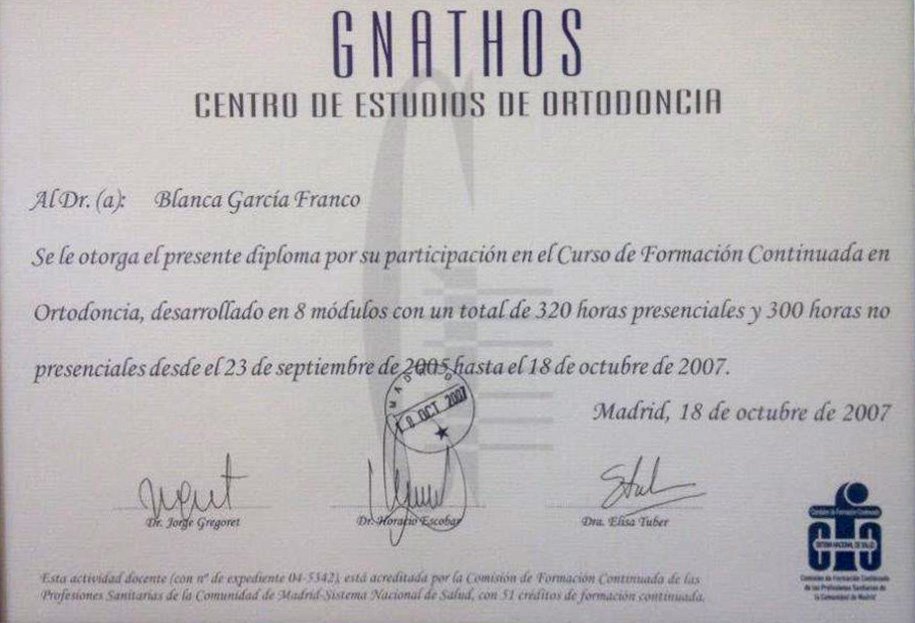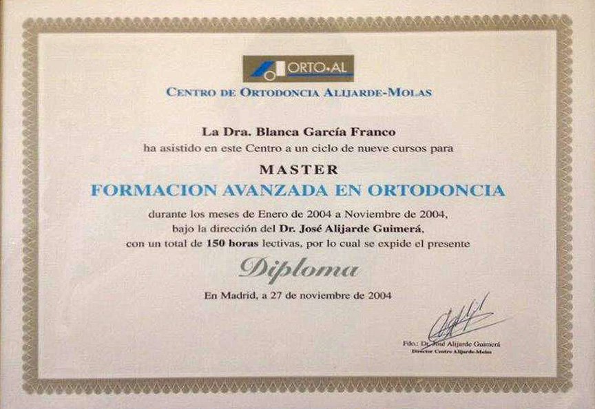 La Dra. Blanca García Franco es licenciada en Odontología por la Universidad Complutense de Madrid, Master en Ortodoncia Avanzada (Ortodoncia Secuencial. Técnica de Arco Recto) con el Dr. D. José Alijarde. Master de ortodoncia GNATHOS con el Dr. Jorge Gregoret. Y Master en ortodoncia “Invisalign provider Platino” con el Dr. Manuel Román Academy.